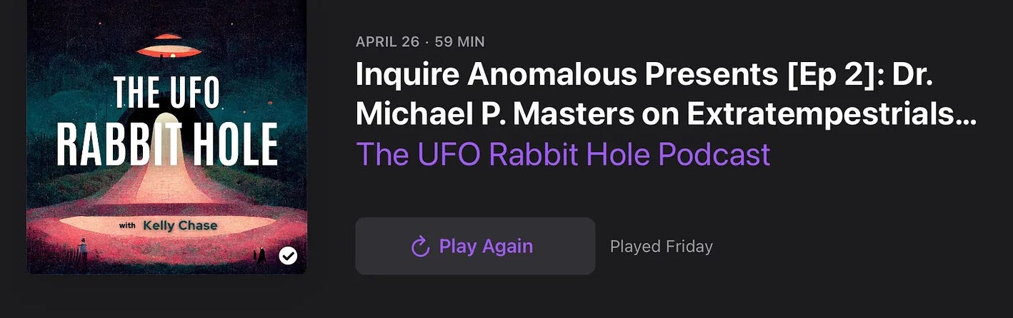 For something ENTIRELY different I suggest you listen to this podcast episode in its entirety. Once the intro things are over we hear Dr. Masters explain some of the detailed physical anthropology he thinks may be consistent with his extratempestrial theory of the nature of “UFO visitors.” Even if you think it’s stuff and nonsense, listen anyway. He’s a serious guy with real science behind his ideas. This part gets a bit tedious, for sure. BUT what happens next is worth waiting for. He tells his own story of “contact” for the first time to the folks he’s speaking to. I think you‘ll agree that he is totally believable, and compelling. At one level the story isn’t wildly weird. It’s kind of prosaic. Except for the telepathy and the bizarreness of the whole narrative. It’s that mixture of seeming almost-normality mixed with the Impossible that stays with you. What are we to do with this…? [Click on the image and it will try to take you to Apple Podcasts - if that fails, you can find The UFO RABBIT HOLE in any podcast player.]